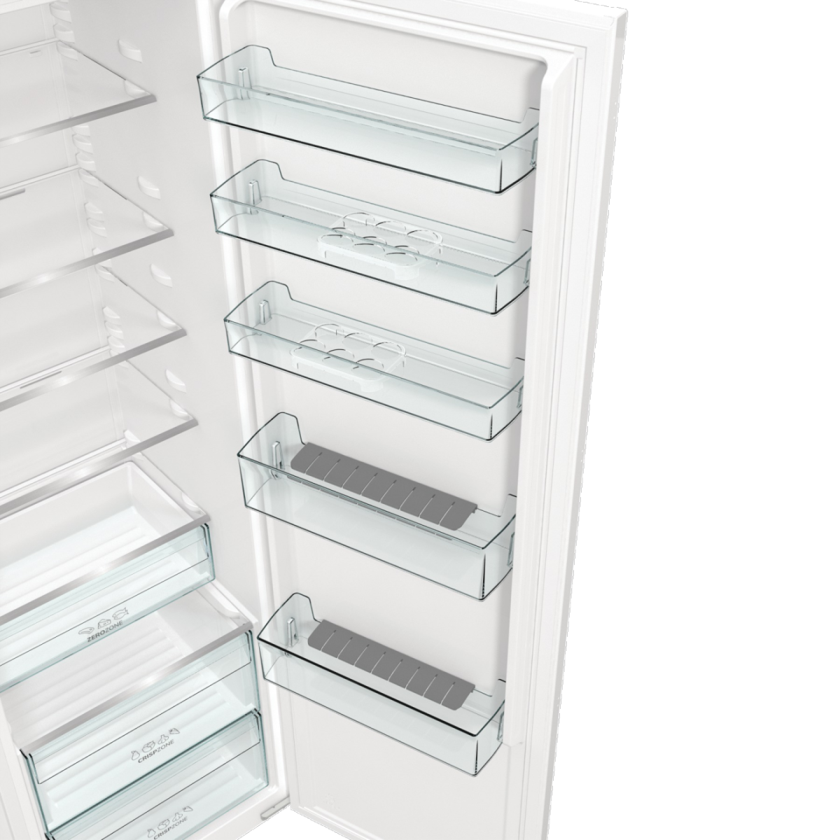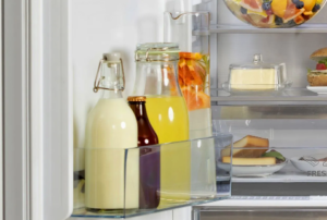 La porte du réfrigérateur offre un espace de rangement généreux, même pour les plus grandes bouteilles en verre ou en plastique. Une grille spéciale maintient les bouteilles en place pour éviter qu’elles ne glissent et ne s’abîment à l’ouverture ou à la fermeture de la porte.
